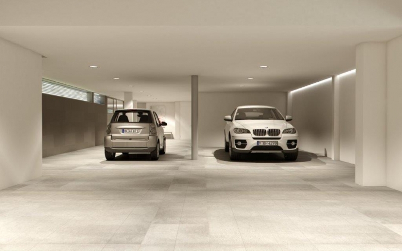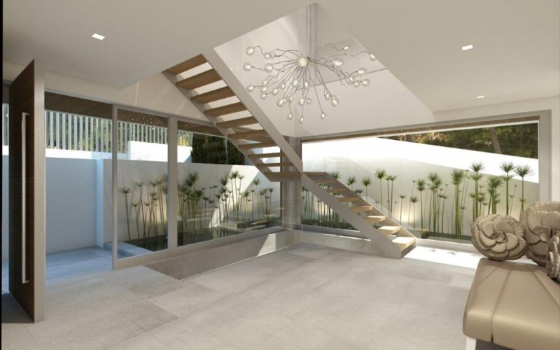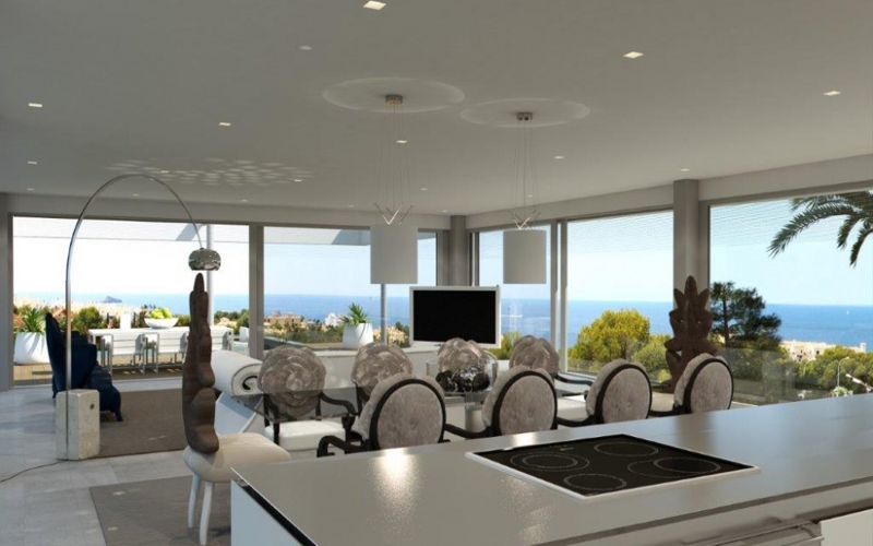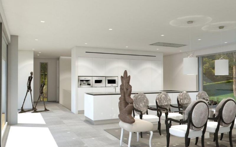 En la primera planta se encuentra el gran salón-comedor con cocina Americana y acceso a la amplia terraza y la otra piscina. Una escalera conduce a la azotea con cocina de verano y una zona parcialmente cubierta con jacuzzi. El aparcamiento subterráneo, conectado a las otras plantas por ascensor, ofrece espacio para 5 coches. Alternativamente existe la posibilidad de disponer de 3 plazas de garaje y un apartamento de invitados con salón comedor, dos dormitorios con baño y cocina. En el mismo nivel hay una coladuria.