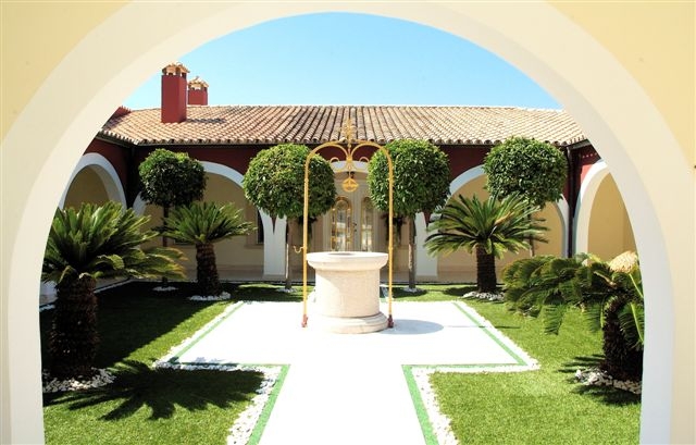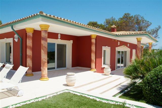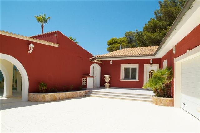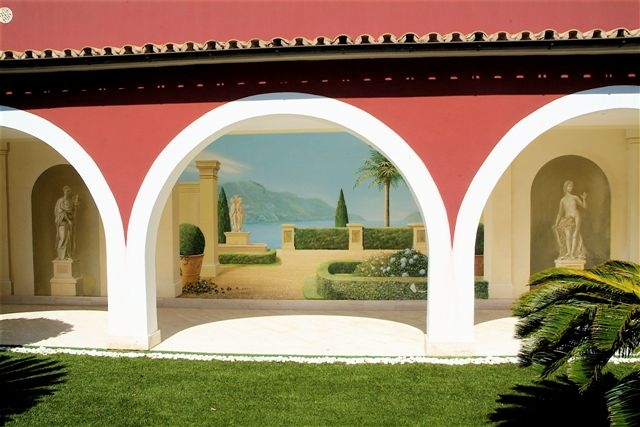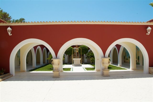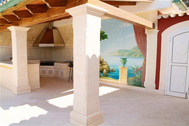 Im Außenbereich befinden sich großzügige teils überdachte Terrassenbereiche, ein Säulengang mit Wandmalerei, ein Garten mit automatischer Bewässerung, Swimmingpool, Sommerküche, ein großer Innenhof und eine Doppelgarage.