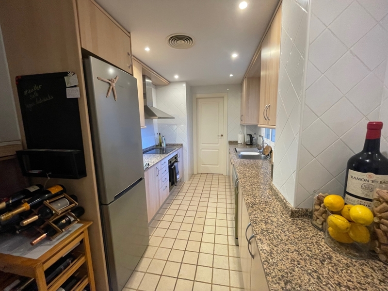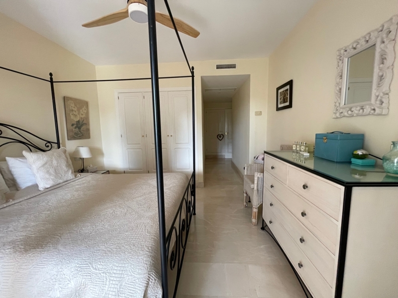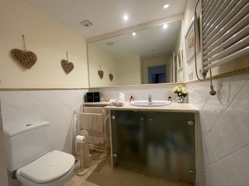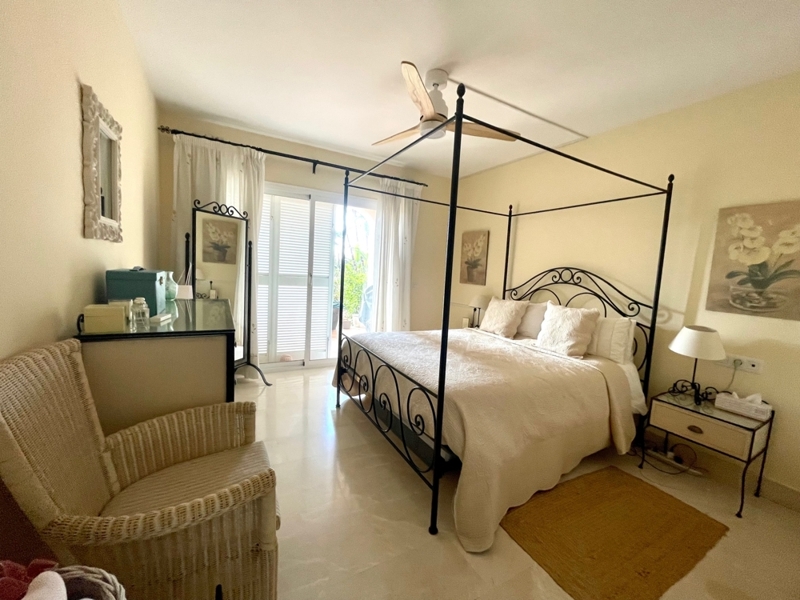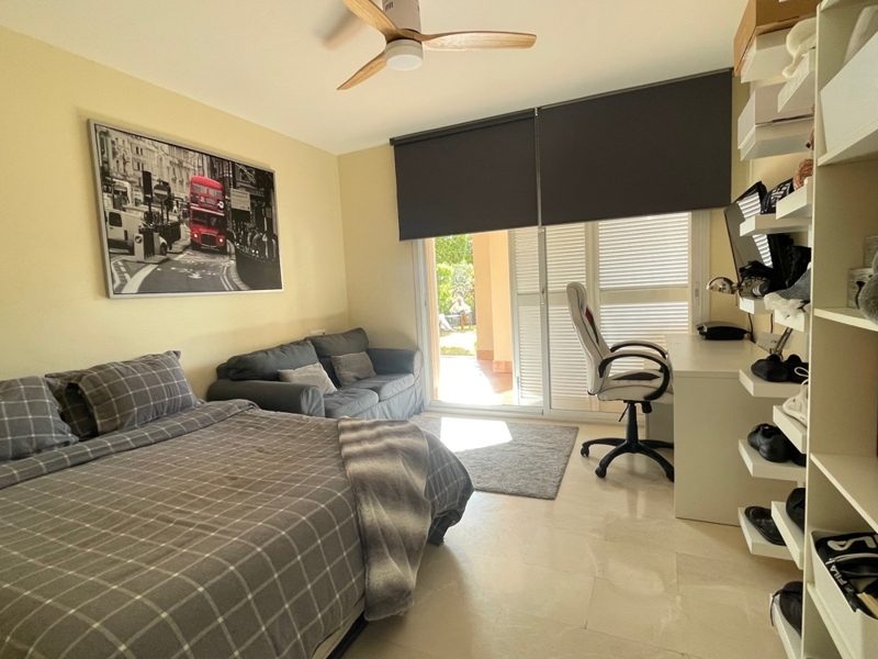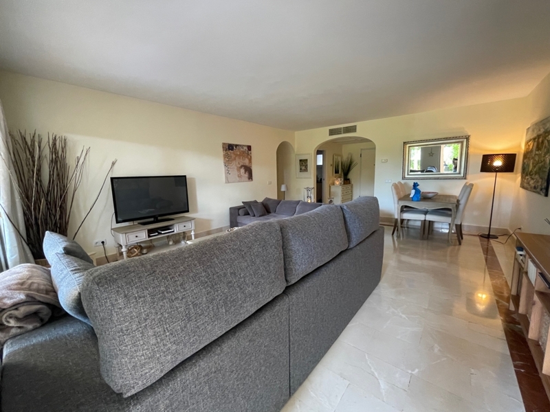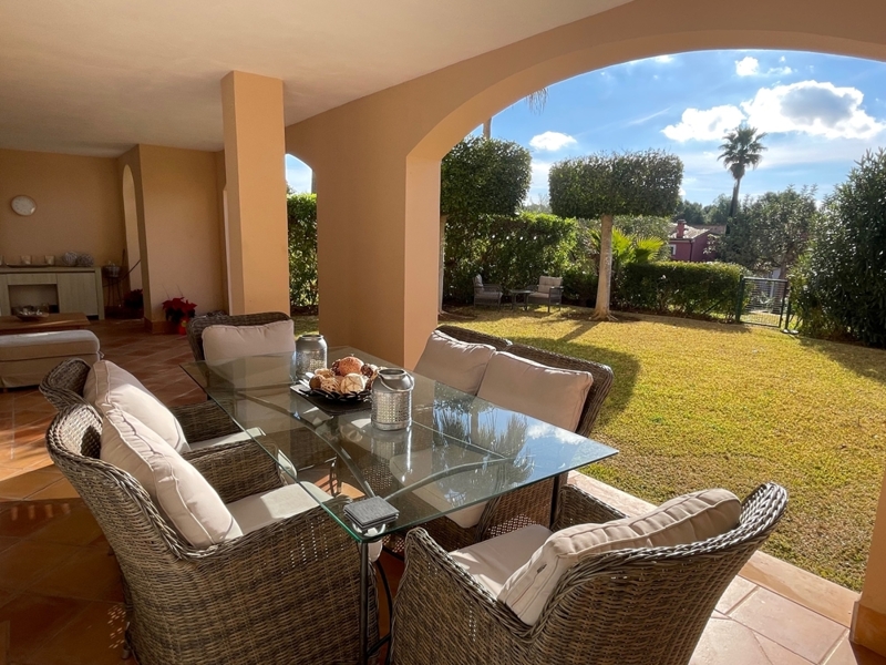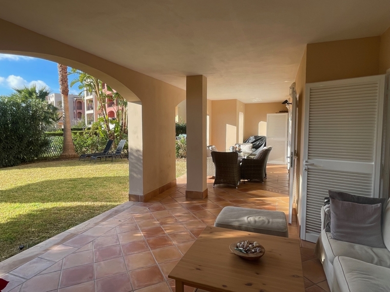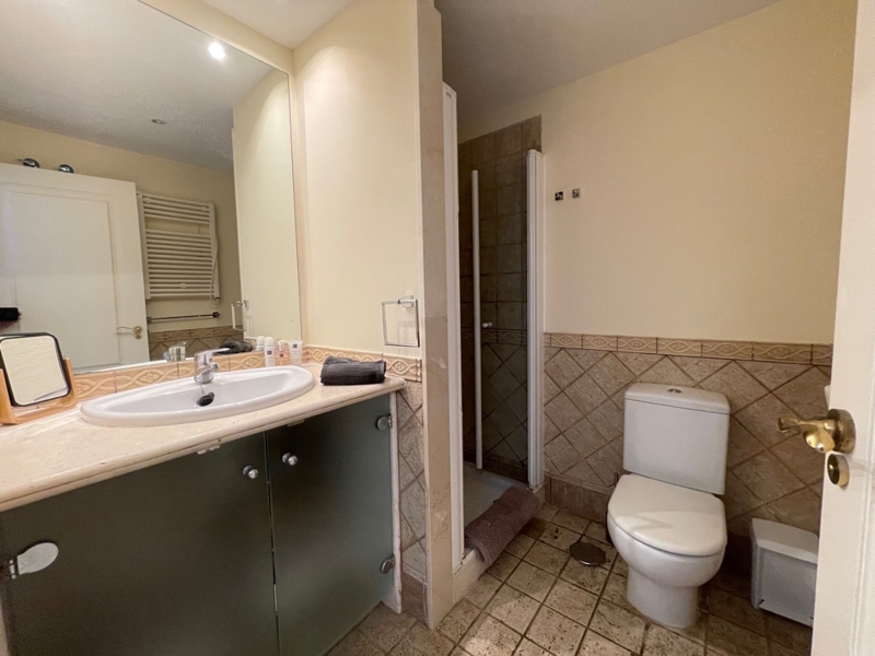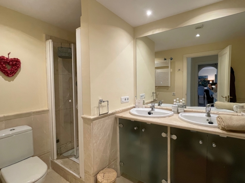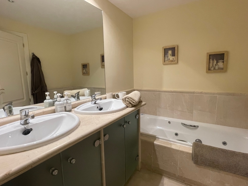 Die Wohnung bietet auf einer Ebene einen großen Wohn-Essraum mit Zugang zur Terrasse und Garten, 2 Schlafzimmer mit 2 Bädern en Suite, ein Gäste-WC und eine komplett ausgestattete Küche mit HWR.
